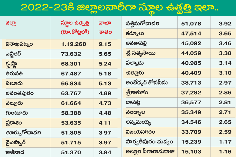 ఈ క్రమంలో 2022–23 ఆర్థిక సంవత్సరానికి ప్రస్తుత ధరల ప్రకారం జిల్లాల వారీగా స్థూల ఉత్పత్తిని డైరెక్టరేట్ ఆఫ్ ఎకనామిక్స్ అండ్ స్టాటిస్టిక్స్ తాజాగా వెల్లడించింది. మొత్తం రాష్ట్ర స్థూల ఉత్పత్తిలో విశాఖపట్నం జిల్లా వాటా 9.15 శాతం ఉండగా ఎన్టీఆర్ జిల్లా వాటా 5.65 శాతం, కృష్ణా జిల్లా వాటా 5.24 శాతం ఉంది. ఇక చివరి స్థానంలో అల్లూరి సీతారామరాజు జిల్లా 1.16 శాతం వాటాతో నిలిచింది.