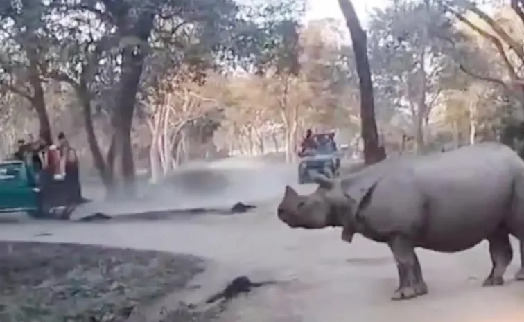 కజిరంగా నేషనల్ పార్క్లో ఖడ్గమృగం మంద నడుమ.. టూరిస్టుల జీపులు తిరుగుతూ కనిపించాయి. అయితే మరి దగ్గరగా ఉండడంతో.. వేగంగా వెళ్లేందుకు రెండు జీపులు ప్రయత్నించాయి. ఈ క్రమంలో హఠాత్తుగా మలుపు తిరిగిన రెండో జీపు వెనుక నుంచి తల్లీకూతుళ్లు కిందపడిపోయారు. అంతే.. ఒక్కసారిగా అటు టూరిస్టులు.. ఇటు ఆ తల్లీకూతుళ్ల అరుపులతో ఆ ప్రాంతం మారుమోగింది. ఆ ఇద్దరికీ అతిసమీపంలోనే ఉన్న ఖడ్గమృగం(Rhino).. వెనక్కి తిరిగివాళ్లను చూసింది. ఈలోపు.. అక్కడే ఉన్న మరో ప్రయాణికుల జీపు వైపుగా ఇంకో రైనో దూసుకెళ్లింది. కట్ చేస్తే..
