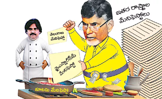 చంద్రబాబు తాజా మేనిఫెస్టోలో సూపర్ సిక్స్ పేరుతో ప్రకటించిన ప్రధాన హామీలు అన్నీ అరువు తెచ్చుకున్నవే. వీటిలో సగం రాష్ట్రంలో ఇప్పటికే అమలవుతున్న పథకాలు కాగా, మిగతావి పక్క రాష్ట్రాల నుంచి కాపీ కొట్టారు. స్కూలుకు వెళ్లే ప్రతి విద్యార్థికి ఏడాదికి రూ.15 వేలు, ప్రతి రైతుకు ఏటా రూ.20 వేల ఆర్థిక సాయం అందించే పథకాలను అమ్మఒడి, రైతు భరోసా పేరుతో వైఎస్ జగన్ ప్రభుత్వం ఎంతో ప్రతిష్టాత్మకంగా ఐదేళ్ల నుంచి అమలు చేస్తోంది.
