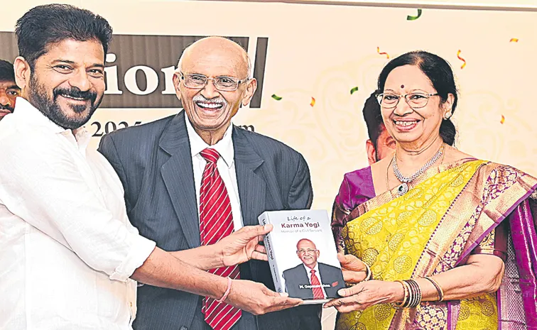 ఆదివారం హైదరాబాద్లో రిటైర్డ్ ఐఏఎస్ గోపాలకృష్ణ దంపతులతో కలసి పుస్తకాన్ని ఆవిష్కరిస్తున్న సీఎం రేవంత్