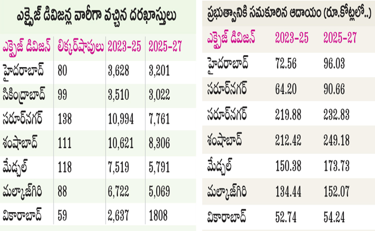 2023–25లో గ్రేటర్ జిల్లాల్లోని ఏడు డివిజన్ల పరిధిలో మొత్తం 45,631 దరఖాస్తులు రాగా, రూ.906.62 కోట్ల ఆదాయం సమకూరింది. 2025–27 ఆర్థిక సంవత్సరంలో 639 మద్యం షాపులకు నిర్వహించిన టెండర్లలో 34,958 దరఖాస్తులే వచ్చాయి. ఫీజు పెంపు కారణంగా రూ.1,048.74 కోట్ల ఆదాయం సమకూరింది. ఇదిలా ఉంటే ఆయా మద్యం దుకాణాలకు ఈ నెల 27న ఉదయం 11 గంటలకు జిల్లా కలెక్టర్ల సమక్షంలో లక్కీడ్రా నిర్వహించనున్నారు.