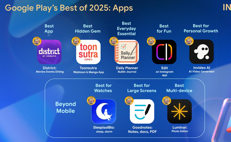 గూగుల్ ప్లే యాప్ స్టోర్లో 2025లో అందుబాటులో ఉన్న యాప్లలో గేమ్స్, పర్సనల్ గ్రోత్, ఎవ్రీడే ఎషన్షియల్.. ఇలా ఒక్కో అంశానికీ కొన్ని ఉత్తమ యాప్లను పేర్కొంటూ జాబితాను విడుదల చేసింది. వీటిలో ఏఐ అనుసంధానిత యాప్లదే పైచేయి. ఉదాహరణకు ఓవరాల్ బెస్ట్ యాప్గా జొమాటోకు చెందిన సోషల్ యుటిలిటీ యాప్ ‘డిస్ట్రిక్ట్’ నిలిచింది. ఇది ఏఐని వినియోగించి వినియోగదారుల అభిరుచులను విశ్లేషించి డైనింగ్తో పాటు ఈవెంట్లు, సినిమా టికెట్ల బుకింగ్ వంటి సోషల్ యుటిలిటీ సేవలు రియల్ టైమ్ సమాచారంతో అందిస్తోంది.