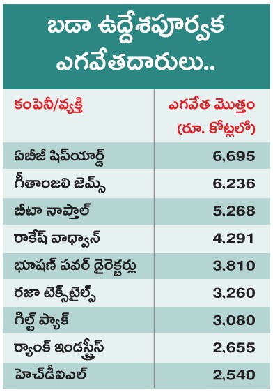 దేశంలో బ్యాంకులకు టాప్–10 ఉద్దేశపూర్వక ఎగవేతదారుల నుంచి రూ.40,635 కోట్ల బకాయిలు పేరుకుపోయాయని కేంద్ర ఆర్థిక మంత్రి నిర్మలా సీతారామన్ తెలిపారు. ఈ జాబితాలో ఏబీజీ షిప్యార్డ్ (రూ.6,695 కోట్లు), గీతాంజలి జెమ్స్ (రూ.6,236 కోట్లు), బీటా నాప్తాల్ (రూ.5,268 కోట్లు), రాకేష్ కుమార్ కుల్దీప్ సింగ్ వాధ్వాన్ (రూ.4,291 కోట్లు) ఉన్నట్లు లోక్సభకు ఇచ్చిన రాతపూర్వక సమాధానంలో ఆమె వెల్లడించారు.