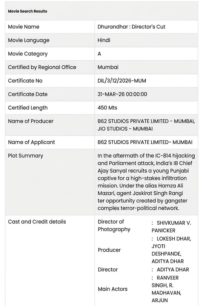 ఇదలా ఉండగానే ఇప్పుడు డైరెక్టర్స్ కట్ పేరిట 'ధురంధర్' చిత్రాన్ని ఏడున్నర గంటల నిడివితో థియేటర్లలోకి తీసుకురాబోతున్నారనే న్యూస్ బయటకొచ్చింది. మంగళవారం(మార్చి 31)న ఈ మేరకు సదరు భారీ నిడివి మూవీకి సెన్సార్ జరిగినట్లు ఓ ఫొటో వైరల్ అవుతోంది. ఏప్రిల్ 5 నుంచి దేశవ్యాప్తంగా ఎంపిక చేసిన థియేటర్లలో మాత్రమే ఈ సినిమా అందుబాటులోకి రానుందని తెలుస్తోంది. ఐమాక్స్, DC, HDR, EPIQ వంటి ప్రీమియం స్క్రీన్లలో మాత్రమే ప్రదర్శించే అవకాశం ఉందని తెలుస్తోంది.