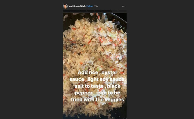 తాజాగా తన భర్త జూబిన్ ఇరానీ కోసం స్మృతి ప్రత్యేకంగా ఎగ్ ఫ్రైడ్ రైస్ తయారుచేశారు. అందుకు సంబంధించిన ఫొటోలను ఇన్స్టాగ్రామ్లో పోస్ట్ చేశారు. అలాగే ఎగ్ ఫ్రైడ్ రైస్ ఎలా తయారు చేయాలో కూడా ఆమె వివరించారు. క్యాప్షన్స్తో కూడిన 7 ఫొటోలను తన ఇన్స్టాగ్రామ్ స్టోరిస్లో ఉంచారు. కాగా, కొద్దిరోజుల క్రితం స్మృతి తన కూతురు జోయిష్ ఇరానీ కోసం వెజ్ న్యూడిల్స్, చికెన్ మంచురియాను తయారు చేసిన సంగతి తెలిసిందే.