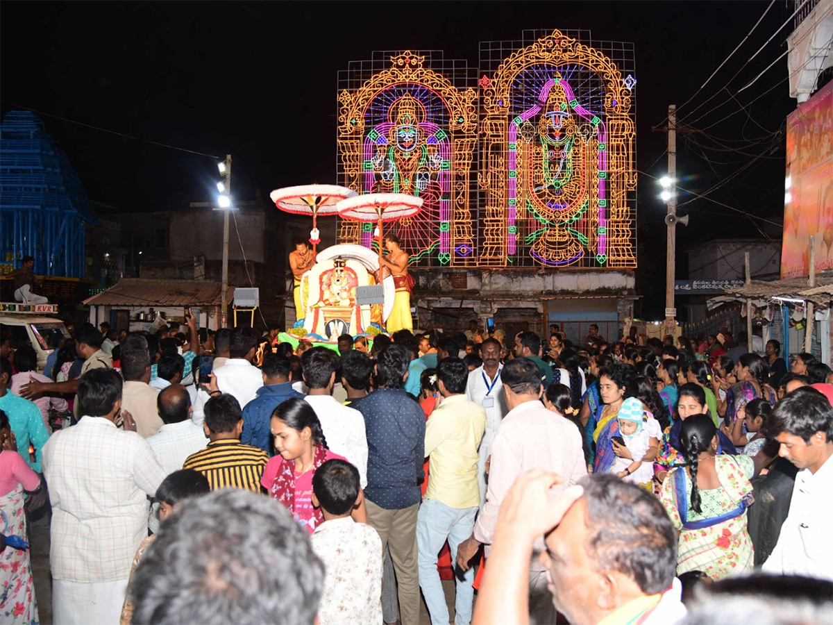 సాయంత్రం ఆలయ ప్రాంగణంలో ఉత్సవ మూర్తులను ఊయలపై ప్రతిష్ఠించారు. భక్తిగీతాలాపనల మధ్య స్వామికి ఊంజల సేవ నిర్వహించారు. రాత్రి స్వామి వారిని చంద్రప్రభ వాహనంపై కొలువుదీర్చి మాడవీధుల్లో వైభవోపేతంగా ఊరేగించారు