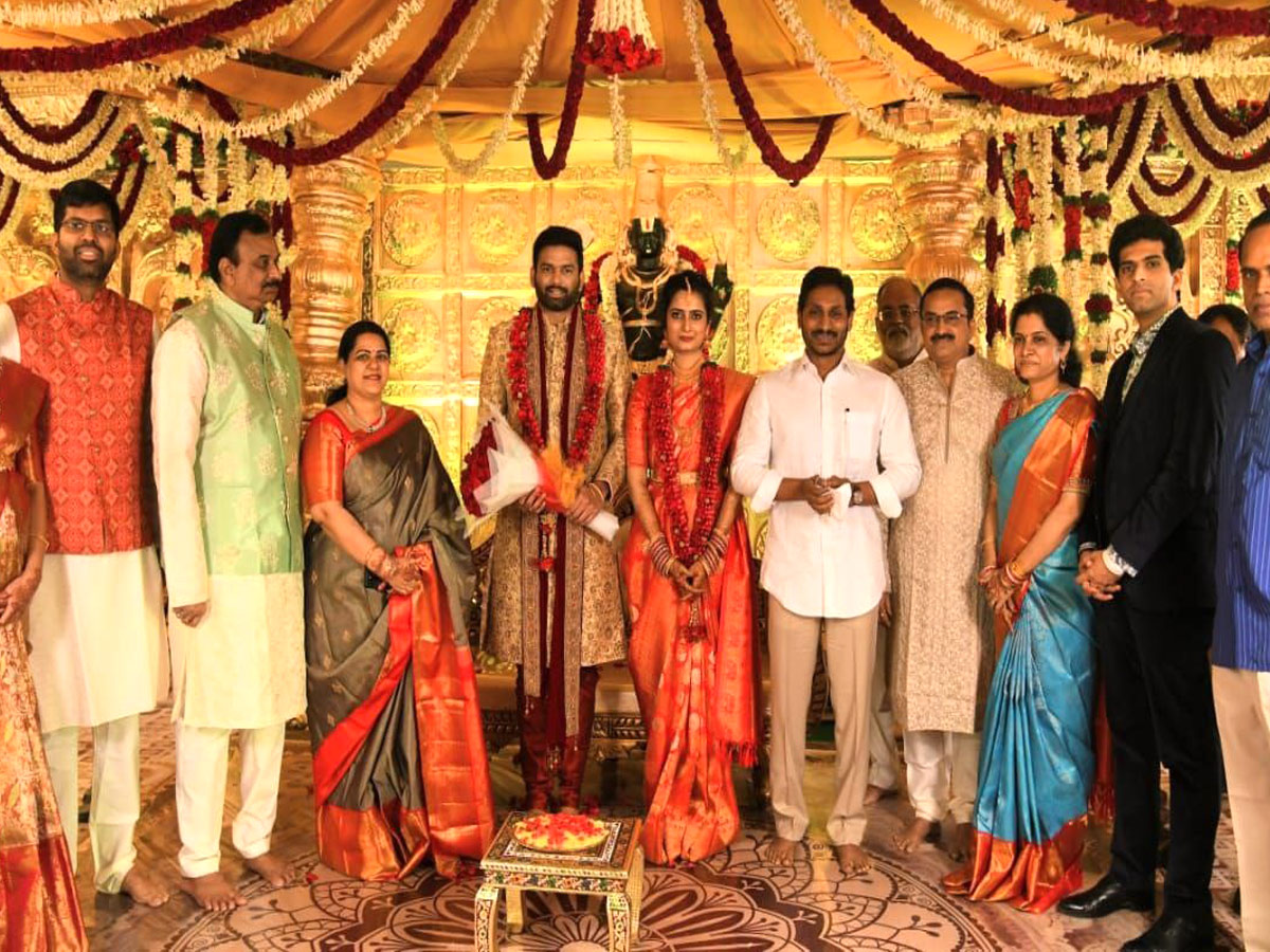 గుంటూరు జిల్లా మంగళగిరి మండలం ఆత్మకూరు గ్రామపరిధిలోని సీకే కన్వెన్షన్లో ఆదివారం రాత్రి జరిగిన వివాహానికి రాష్ట్ర గవర్నర్ విశ్వభూషణ్ హరిచందన్, సీఎం వైఎస్ జగన్మోహన్రెడ్డి హాజరై నూతన వధూవరులను ఆశీర్వదించారు.