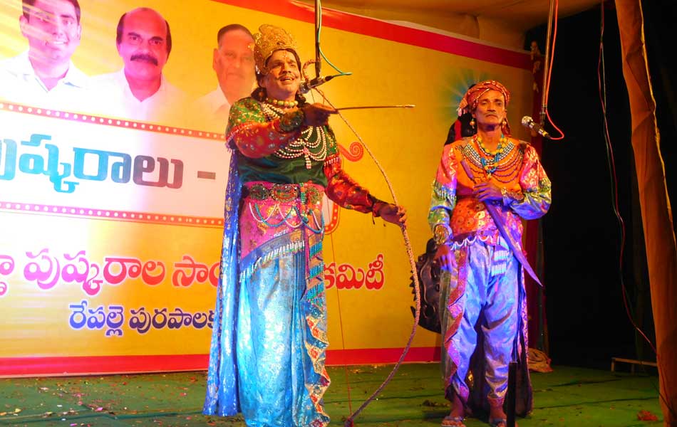 గుంటూరు డెస్క్‌: కృష్ణా పుష్కరాల సందర్భంగా పుష్కర కళావేదికలపై కళాకారులు పౌరాణిక ఇతిహాసాలకు సంబంధించి వివిధ కళా రూపాల్లో ప్రదర్శనలిస్తూ భక్తులను ఆకట్టుకుంటున్నారు.