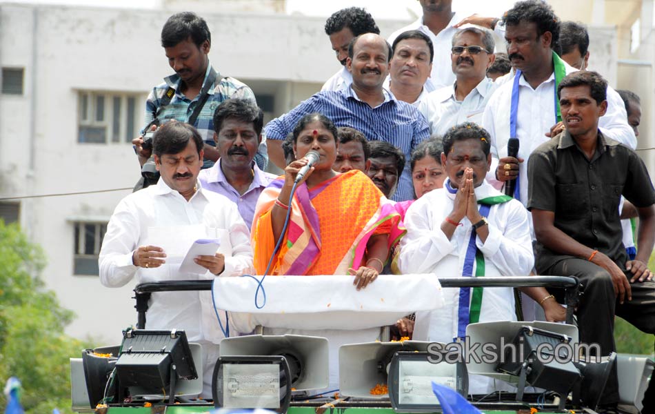 ఎన్నికల ప్రచారంలో భాగంగా వైఎస్ఆర్ కాంగ్రెస్ పార్టీ అధినేత వైఎస్ జగన్మోహన్ రెడ్డి కృష్ణా జిల్లా మైలవరంలో శుక్రవారం రాత్రి జరిగిన రోడ్ షోలో జగన్ ప్రసంగించారు. పార్టీ గౌరవ అధ్యక్షురాలు వై.ఎస్.విజయమ్మ శుక్రవారం విశాఖపట్నం జిల్లా పరవాడలో జరిగిన సభలో విజయమ్మ ప్రసంగించారు. ప.గో.జిల్లాలోని కొయ్యలగూడెం ఎన్నికల ప్రచార సభలో హాజరైన షర్మిలకు ప్రజలు బ్రహ్మరథం పట్టారు.