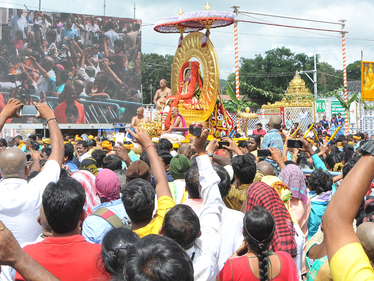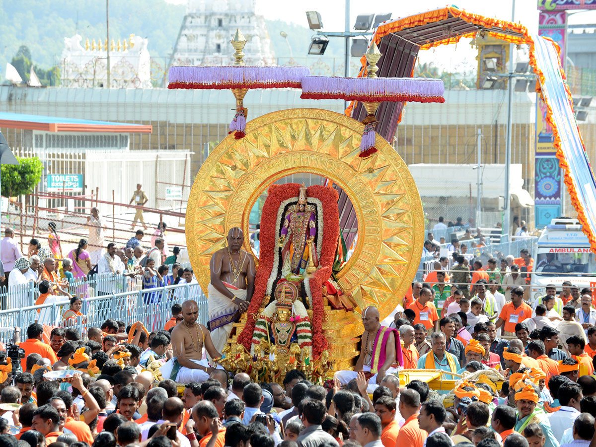 తిరుమల: తిరుమలేశుని నవరాత్రి బ్రహ్మోత్సవాలు వైభవంగా సాగుతున్నాయి. ఏడో రోజు ఉదయం ఏడుకొండలస్వామి సూర్యప్రభ వాహనంపై ఊరేగుతూ భక్తులకు దర్శనమిచ్చారు. అధిక సంఖ్యలో తరలివచ్చిన భక్తులు స్వామివారికి కర్పూర హారతులు, నైవేద్యాలు సమర్పించారు.