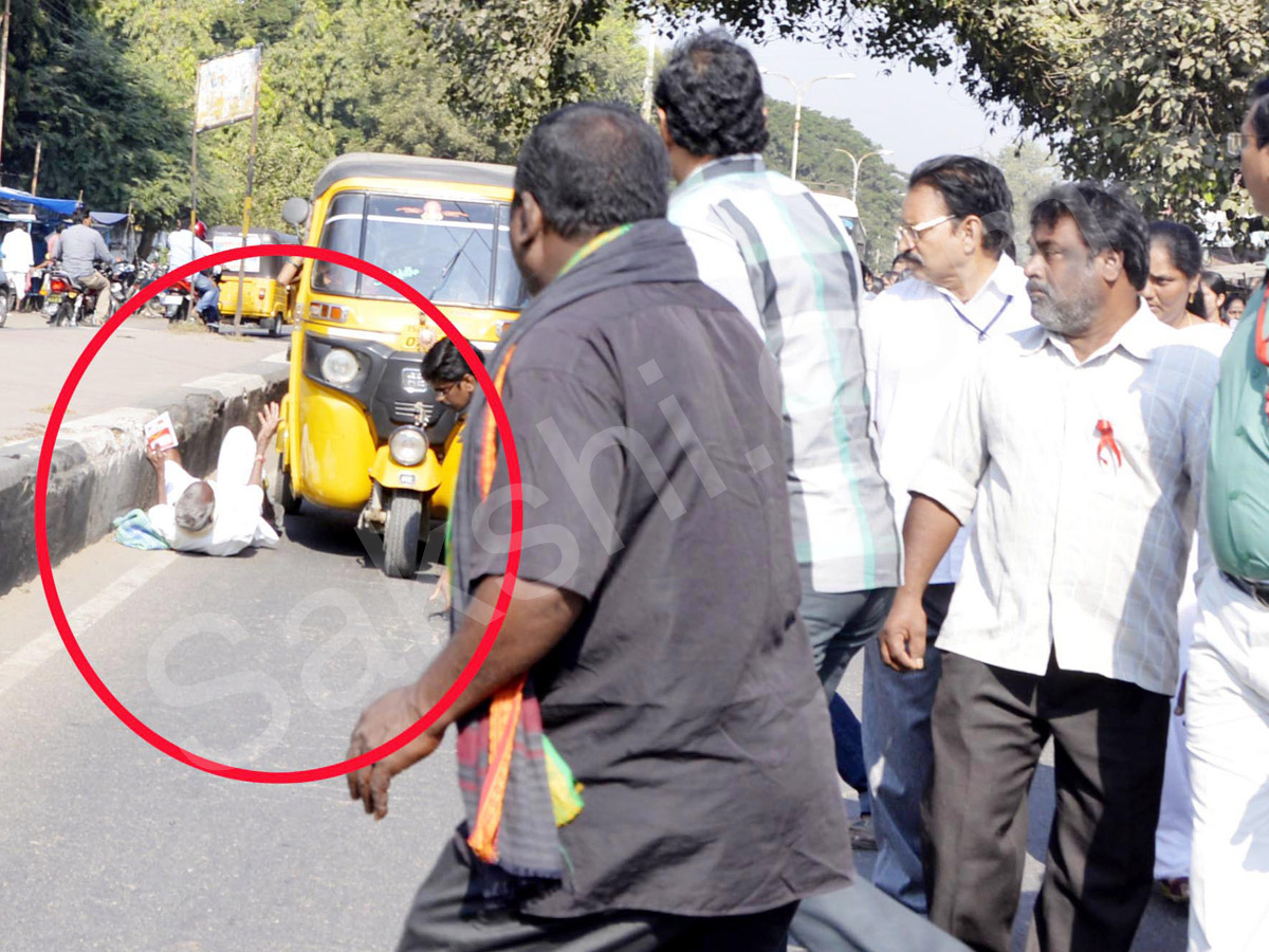 ఆటోవాలా అత్యుత్సాహం.. ఆటో ఢీకొట్టడంతో ఆటోకు డివైడర్ మధ్య పడిపోయిన వృద్ధుడు.. ఫొటో: దశరథ్ రజ్వా, కొత్తగూడెం