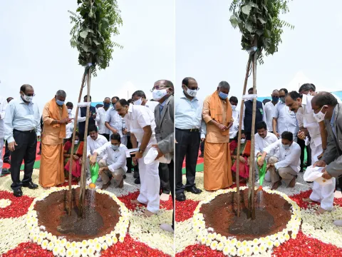 సాక్షి, కృష్ణాజిల్లా: ‘ప్రతి ఒక్కరూ విరివిగా మొక్కలు నాటి చెట్లు పెంచడం ద్వారా ప్రతి ఇంటినీ, ప్రతి ఊరునూ పచ్చదనంతో సింగారిద్దాం’ అనే నినాదంతో 71వ వన మహోత్సవాన్ని బుధవారం ముఖ్యమంత్రి వైఎస్ జగన్మోహన్రెడ్డి ప్రారంభించారు. కృష్ణా జిల్లా ఇబ్రహీంపట్నంలోని గాజులపాడు ‘వనం మనం’ ప్రాంగణానికి చేరుకొన్న ఆయన.. పేదల కోసం ఏర్పాటు చేసిన లే అవుట్లో మొక్కలు నాటి ‘జగనన్న పచ్చతోరణం’ కార్యక్రమానికి శ్రీకారం చుట్టారు. వేప, రావి మొక్కలు నాటి నీరు పోశారు. ఈ సందర్భంగా సీఎం జగన్ మాట్లాడుతూ.. వన మహోత్సవంలో భాగంగా 20 కోట్ల మొక్కల్ని నాటేందుకు లక్ష్యంగా పెట్టుకున్నట్లు తెలిపారు. రాష్ట్రంలో 13 వేల పంచాయితీలు ఉంటే, 17 వేల లే అవుట్లు సిద్ధం చేశామని.. ప్రతి ఒక్కరు విధిగా మొక్కలు నాటాలని విజ్ఞప్తి చేశారు. మొక్కల్ని నాటాలని కోరుతూ మంత్రులు, ఎమ్మెల్యేలు, ప్రజలు, అధికారులతో ఈ సందర్భంగా ప్రతిజ్ఙ చేయించారు. అదే విధంగా... ఆగస్టు 15న 30 లక్షల మందికి పేదలకు ఇళ్ల పట్టాలు ఇస్తామని సీఎం జగన్ పునరుద్ఘాటించారు. ‘‘పేదల సొంతింటి కలను నిజం చేసేందుకు ఇళ్ల పట్టాలు ఇస్తుంటే టీడీపీ నేతలు అడ్డుపడుతున్నారు. కుట్రపూరిత రాజకీయాలు చేస్తున్నారు. కేసులు వేస్తున్నారు. వారి వల్ల సుప్రీంకోర్టుకు వెళ్లాల్సిన పరిస్థితి ఏర్పడింది. భారత స్వాతంత్ర్య దినోత్సవం రోజున పేదలకు ఇళ్ల స్థలాలు అందించే కార్యక్రమం చేస్తాం’’ అని పేర్కొన్నారు. ఈ కార్యక్రమంలో మంత్రులు పెద్దిరెడ్డి రామచంద్రారెడ్డి , బాలినేని శ్రీనివాస్ రెడ్డి , కొడాలి నాని , పేర్ని నాని , వెల్లంపల్లి శ్రీనివాస్, ఎమ్మెల్యే వసంత వెంకట కృష్ణప్రసాద్ , సీఎం ప్రోగ్రాం కో-ఆర్డినేటర్ తలశిల రఘురాం , మహిళాకమిషన్ ఛైర్పర్సన్ వాసిరెడ్డి పద్మ తదితరులు ఈ కార్యక్రమంలో పాల్గొన్నారు. కోవిడ్ వ్యాప్తి నేపథ్యంలో భౌతిక దూరం నిబంధనలు పాటించేలా జాగ్రత్తలు వహిస్తూ నవరత్నాల తరహాలో తొమ్మిది రకాల మొక్కలు నాటారు. కాగా వన మహోత్సవాన్ని ప్రతిష్టాత్మకంగా నిర్వహిస్తున్న రాష్ట్ర ప్రభుత్వం ప్రభుత్వం.. పేదల కోసం సిద్ధం చేసిన పదిహేడు వేల లే అవుట్లను పచ్చదనంతో నింపేందుకు సంకల్పించింది. ఈ క్రమంలో ప్రభుత్వం తరపున ఆరు కోట్ల మొక్కలు నాటేందుకు ఏర్పాట్లు జరుగుతున్నాయి. రాష్ట్ర వ్యాప్తంగా ఇరవై కోట్ల మొక్కలు నాటాలన్న లక్ష్యంతో ‘జగమంతా వనం.. ఆరోగ్యంతో మనం’ అనే నినాదంతో అధికారులు మందుకు వెళ్తున్నారు. ప్రతీ ఒక్కరూ పది మొక్కలు నాటి పర్యావరణ పరిరక్షణ యజ్ఞంలో భాగస్వాములు కావాలని పిలుపునిస్తున్నారు. ప్రతి ఇల్లు, ప్రతీ ఊరూ పచ్చదనంతో సింగారిద్దామంటూ.. హంగూ ఆర్భాటాలకు ప్రాధాన్యం ఇవ్వకూడదన్న సీఎం జగన్ సూచనల మేరకు సాదాసీదాగా కార్యక్రమాన్ని నిర్వహించారు. -