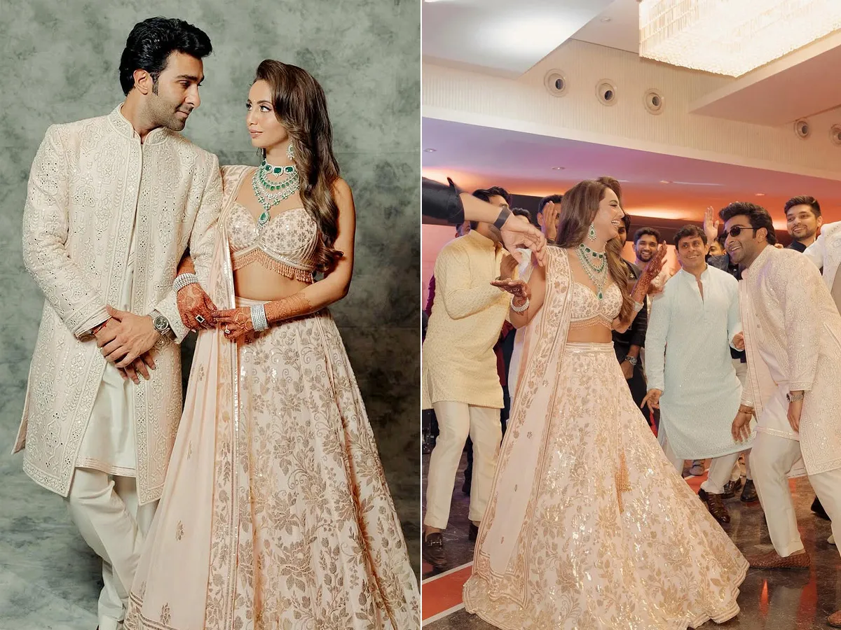 బాలీవుడ్ లెజెండ్రీ నటుడు రాజ్ కపూర్ మనవడు, నటుడు అదార్ జైన్, అలేఖా అద్వానీని హిందు సాంప్రదాయం ప్రకారం వివాహం చేసుకున్నాడు. ఈ ఏడాది జనవరి 12న గోవాలో గోవాలో పెళ్లి చేసుకున్న ఈ జంట మరోసారి(ఫిబ్రవరి 21, శుక్రవారం) హిందూ వివాహంతో తమ ప్రేమను చాటుకున్నారు. ఈ గ్రాండ్ వేడుకకు పలువురు బాలీవుడ్ స్టార్లు ఇతర ప్రముఖులు హాజరయ్యారు. రణ్బీర్ కపూర్ అలియా, సైఫ్, కరీనా కపూర్ ఖాన్, కరిష్మా, నీతూ కపూర్తో పాటు, రిలయన్స్ అధినేత ముఖేష్ అంబానీ పెద్ద కుమారుడు ఆకాష్ అంబానీ, శ్లోకా మెహతా దంపతులు, అనిల్ అంబానీ, టీనాజంట, సీనియర్ నటి రేఖ, అగస్త్య నందా వేదిక సందడి చేశారు.వధువు అలేఖా అద్వానీ ప్రముఖ డిజైనర్ సబ్యసాచి ముఖర్జీ తయారు చేసిన ఎథ్నిక్ మాస్టర్ పీస్లో అందంగా ముస్తాబైంది. రెడ్ వెల్వెట్ లెహెంగాపై వాటర్ఫాల్ స్టైల్ గిల్డెడ్ డబ్కా ఎంబ్రాయిడరీతో రూపొందించారు. దీనికి జతగా గోల్డ్ జర్దోజీ ఎంబ్రాయిడరీతో హాఫ్-స్లీవ్డ్ వెలోర్ క్రాప్డ్ బ్లౌజ్ మంచి ఎలిగెంట్ లుక్ ఇచ్చింది. అలాగే లేటెస్ట్ ట్రెండ్కు అనుగుణంగా డబుల్ మ్యాచింగ్ క్రిమ్సన్ ఆర్గాన్జా దుపట్టాలో అలేఖా అందంగా మెరిసింది. ఇంకా పర్ఫెక్ట్ మ్యాచింగ్గా పోల్కి కుందన్స్ పచ్చలు పొదిగిన నెక్లెస్ మాంగ్ టీకా ఆభరణాలను ధరించింది. వరుడు ఆదర్ జైన్ ఐవరీకలర్ షేర్వానీ, ఎటాచ్డ్ దుపట్టా, క్లాసిక్ వైట్ స్ట్రెయిట్ ఎథ్నిక్ ప్యాంటు, తలపాగా ధరించారు. ఇక ఆభరణాల విషయానికి వస్తే, పచ్చల లేయర్డ్ నెక్లెస్ ,తలపాగామీద ఎమరాల్డ్ స్టేట్మెంట్ గోల్డ్ నగలతో రాజసంగా కనిపించాడు. కుటుంబ సభ్యులు , స్నేహితుల సమక్షంలో వివాహ వేడుక తర్వాత ఆదర్ తన భార్య అలేఖ అద్వానీ నుదుటిపై ప్రేమగా ముద్దు పెట్టుకున్నాడు.దీంతో అలేఖా సిగ్గుల మొగ్గే అయింది. దీంతో కొత్తగా పెళ్లైన జంటను ఆశీర్వదించారు. -