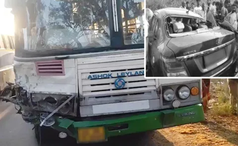 సూర్యాపేట జిల్లా: జిల్లాలో ఘోర రోడ్డు ప్రమాదం సంభవించింది. చివ్వెంల మండలం బీబీ గూడెం వద్ద జరిగిన ఘోర రోడ్డు ప్రమాదంలో నలుగురు దుర్మరణం చెందారు. ఆర్టీసీ బస్సు, కారు ఢీకొనడంతో నలుగురు అక్కడికక్కడే ప్రాణాలు కోల్పోగా, ఆరుగురికి తీవ్ర గాయాలయ్యాయి. వీరిని స్థానిక ఆస్పత్రికి తరలించి చికిత్స అందిస్తున్నారు. ఇందులో ఇద్దరి పరిస్థితి విషమంగా ఉన్నట్లు తెలుస్తోంది. ఈ రోడ్డు ప్రమాదంలో మరణించి వారిలో ముగ్గురిని గడ్డం రవి, గడ్డం రేణుకు, గడ్డం రీతులుగా గుర్తించారు. వీరంతా ఒకే కుటుంబానికి చెందిన వారు. కారు నుజ్జు నుజ్జు కావడంతో వీరు స్పాట్ లో మరణించారు. గడ్డం రవి, ఇతర బంధువులు కలిసి మోతె మండలం కోటపహాడ్ లో శుభకార్యానికి వెళ్లి వస్తుండగా ఈ ప్రమాదం జరిగింది. అతి వేగమే ప్రమాదానికి కారణంగా తెలుస్తోంది. బస్సును కారు బలంగా ఢీకొట్టడంతో నలుగురు ప్రాణాలు కోల్పోయారు. మరో రోడ్డు ప్రమాదం.. ఇద్దరు మృతిహనుమకొండ జిల్లా హసన్పర్లి మండలం చెరువు కట్ట వద్ద మరో రోడ్డు ప్రమాదం చోటు చేసుకుంది. ద్విచక్ర వాహనాన్ని టిప్పర్ లారీ ఢీ కొట్టడంతో ఇద్దరు యువకులు అక్కడక్కడే దుర్మరణం చెందారు. మృతులు సీతం పేటకు చెందిన మహేష్, పవన్ లుగా గుర్తించారు పోలీసులు. -