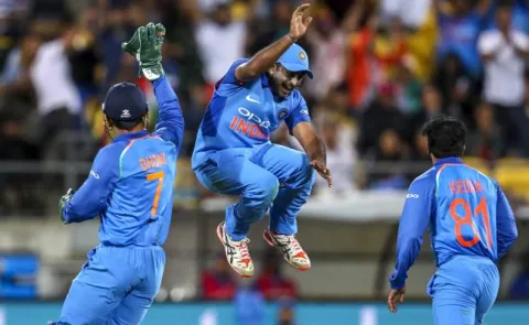 వెల్లింగ్టన్ : న్యూజిలాండ్తో ఆదివారం జరిగిన చివరి వన్డేలో భారత్ 35 పరుగుల తేడాతో విజయం సాధించింది. ఈ గెలుపుతో 4-1తో సిరీస్ నెగ్గి 52 ఏళ్లుగా సాధ్యం కాని ఘనతను సొంతం చేసుకుంది. 1967 నుంచి కివీస్ పర్యటనకు వెళుతున్న టీమిండియా ఇప్పటివరకు ఒక్కసారి మాత్రమే 3-1 తేడాతో సిరీస్ విజయాన్ని (2008-09 పర్యటనలో) అందుకుంది. తాజాగా 4-1తో అతిపెద్ద సిరీస్ విజయాన్ని సొంతం చేసుకుని నయా చరిత్రను సృష్టించింది. చివరి మ్యాచ్లో బౌలింగ్, బ్యాటింగ్ విభాగంలో సమిష్టిగా రాణించి విజయాన్నందుకున్న రోహిత్ సేన నాలుగో వన్డే పరాజయానికి ప్రతీకారం తీర్చుకుంది. టాస్ గెలిచి తొలుత బ్యాటింగ్ చేసిన టీమిండియాను హైదరాబాదీ బ్యాట్స్మన్ అంబటి రాయుడు (90: 113 బంతులు, 8 ఫోర్లు, 4 సిక్స్లు), ఆల్రౌండర్ విజయ్ శంకర్ (45: 64 బంతులు, 4 ఫోర్లు)లు అద్భుత భాగస్వామ్యంతో ఆదుకున్నారు. చివర్లో కేదార్ జాదవ్ (34: 45 బంతుల్లో, 3ఫోర్లు), పాండ్యా (45: 22 బంతుల్లో 2 ఫోర్లు, 5 సిక్స్లు)లు రాణించడంతో భారత్ ఆతిథ్య జట్టుకు 253 పరుగుల లక్ష్యాన్ని నిర్ధేశించింది. అనంతరం ఈ లక్ష్యఛేదనకు బరిలోకి దిగిన కివీస్ 217 పరుగులకు కుప్పకూలింది. దీంతో రోహిత్ సేన 35 బంతులు మిగిలి ఉండగానే 35 పరుగులతో విజయం సాధించింది. అంతకు ముందు లక్ష్యఛేదనకు దిగిన కివీస్ను షమీ దెబ్బతీశాడు. ఓపెనర్లు హెన్రీ నికోల్స్(8), కొలిన్ మున్రోలను పెవిలియన్కు చేర్చాడు. ఆ మరుసటి ఓవర్లోనే రాస్ టేలర్ను పాండ్యా ఎల్బీడబ్ల్యూగా వెనక్కి పంపాడు. ఈ క్రమంలో లాథమ్, విలియమ్సన్లు భారత బౌలర్ల సహనాన్ని పరీక్షించారు. క్రీజులో పాతుకుపోతూ ప్రమాదకరంగా మారుతున్న ఈ జోడిని పార్ట్టైమ్ బౌలర్ కేదార్ జాదవ్ విడగొట్టాడు. కెప్టెన్ విలియమ్సన్(39)ను క్యాచ్ఔట్గా పెవిలియన్ చేర్చాడు. దీంతో ఐదో వికెట్కు నమోదైన 67 పరుగుల భాగస్వామ్యానికి తెరపడింది. మరికొద్ది సేపటికే లాథమ్(37), గ్రాండ్హోమ్(11)లను చహల్ ఎల్బీడబ్ల్యూగా పెవిలియన్ చేర్చాడు. మరో 41 పరుగుల అనంతరం నీషమ్(44) రనౌట్గా వెనుదిరిగాడు. చివర్లో సాట్నర్(22), అశ్లే(10), బోల్ట్(1)ల వికెట్లు కూడా త్వరగా కోల్పోవడంతో కివీస్ ఇన్నింగ్స్ ముగిసింది. భారత బౌలర్లలో చహల్కు మూడు, పాండ్యా, షమీలకు రెండు వికెట్లు పడగా.. భువన్వేశర్, జాదవ్లకు తలో వికెట్ దక్కింది. గట్టెక్కించిన రాయుడు-శంకర్ భారత ఇన్నింగ్స్లో కివీస్ పేసర్ ద్వయం హెన్రీ, బౌల్ట్లు పదునైన బంతులతో చెలరేగడంతో భారత టాప్-4 బ్యాట్స్మెన్ రోహిత్ శర్మ(2), శిఖర్ ధావన్ (6), శుభ్మన్ గిల్(7), ఎంఎస్ ధోని(1)లు స్వల్పస్కోర్లకే పెవిలియన్ క్యూ కట్టారు. దీంతో భారత్ 18 పరుగులకే నాలుగు కీలక వికెట్లు కోల్పోయి కష్టాల్లో పడింది. ఈ క్లిష్ట పరిస్థితిలో అంబటి రాయుడు- విజయ్ శంకర్ భారత ఇన్నింగ్స్ను గట్టెక్కించారు. ఈ క్రమంలో హాఫ్ సెంచరీకి చేరువైన విజయ్ శంక