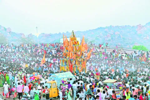 పడమటి ఆంజనేయస్వామి రథాన్ని లాగుతున్న భక్తులు మక్తల్లోని పడమటి ఆంజనేయస్వామి బ్రహ్మోత్సవాలు అంగరంగ వైభవంగా కొనసాగుతున్నాయి. ఈ క్రమంలో గురువారం నిర్వహించిన స్వామివారి రథోత్సవం కనులపండువగా జరిపారు. మంత్రి వాకిటి శ్రీహరి రథానికి ప్రత్యేక పూజలు చేసి.. రథాన్ని బాలాంజనేయస్వామి ఆలయం వరకు లాగారు. అత్యంత వైభవంగా కొనసాగిన ఈ వేడుకను ఉమ్మడి పాలమూరుతో పాటు హైదరాబాద్, కర్ణాటక, మహారాష్ట్ర ప్రాంతాల నుంచి వేలాది మంది భక్తులు తరలివచ్చారు. ఈ సందర్భంగా భక్తుల అంజన్న నామస్మరణతో మక్తల్ రాంలీలా మైదానం మార్మోగింది. – మక్తల్ -