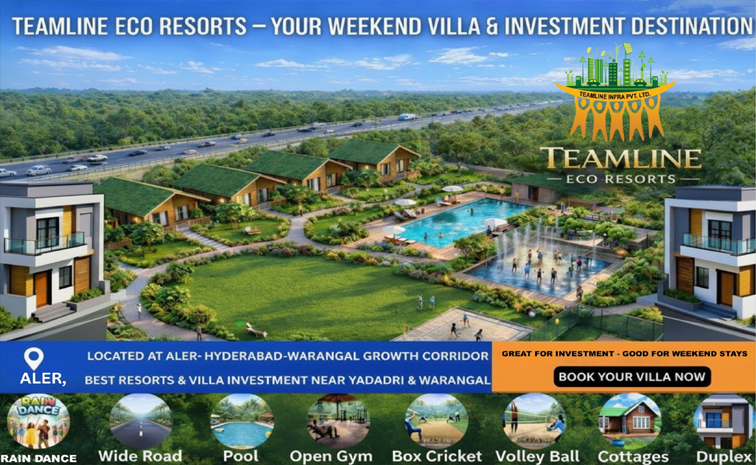 ప్రకృతి, ప్రశాంతత, లగ్జరీ జీవితం.. ఈ మూడింటి సమ్మేళనం Teamline Eco Resorts. మీ కలల విల్లాను ఇప్పుడే బుక్ చేసుకోండి. ప్రకృతి మధ్యలో ఒక కొత్త జీవనాన్ని ప్రారంభించండి.
