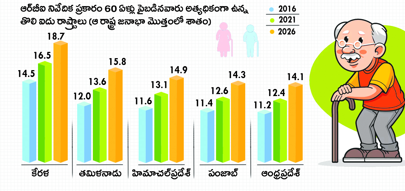 60 ఏళ్ల వయసు జనాభా 10 శాతం నుంచి 15 శాతం మధ్య ఉంటే ఇంటర్మీడియెట్ రాష్ట్రంగా.. 10 శాతం కంటే తక్కువ ఉంటే యువ రాష్ట్రంగా వర్గీకరిస్తారని ఆర్బీఐ నివేదిక స్పష్టం చేసింది. 2026లో ఏపీలో వృద్ధుల జనాభా 14.1 శాతం ఉండగా.. 2031 నాటికి 16.4 శాతానికి, 2036 నాటికి 18.9 శాతానికి పెరుగుతుందని అంచనా. 2016లో దేశంలోని అన్ని రాష్ట్రాలు యువ లేదా ఇంటర్మీడియట్ కేటగిరీలో ఉండగా.. 2026 నాటికి కేరళ, తమిళనాడు 60 ఏళ్లు పైబడిన జనాభాలో 15 శాతం కంటే ఎక్కువ మందితో వృద్ధాప్య వర్గంలోకి ప్రవేశించాయి.