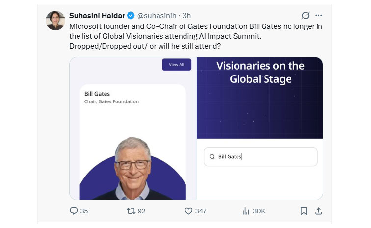 సాక్షి, అమరావతి: గేట్స్ ఫౌండేషన్ చైర్మన్ బిల్గేట్స్పై ఏఐ ఇంఫాక్ట్ వర్గాల్లో విస్తృత చర్చ జరుగుతోంది? గ్లోబల్ విజనరీస్ లిస్ట్ నుంచి బిల్గేట్స్ పేరు మాయమైంది. బిల్గేట్స్ పేరు తొలగించారా? లేక ఆయనే రావడం లేదా? అనేదానిపై చర్చ నడుస్తోంది. ఎక్స్లో ప్రముఖ జర్నలిస్ట్ సుహాసిని హైదర్ పలు సందేహాలు లెవనెత్తారు. బిల్గేట్స్ ఎప్స్టీన్ వివాదంలో చిక్కుకున్న సంగతి తెలిసిందే. ఎప్స్టీన్ ఫైల్స్ వివాదంలో చిక్కుకున్న బిల్ గేట్స్కు చంద్రబాబు ఘన స్వాగతం పలికారు. కూటమి పాలకుల తీరుపై నెటిజన్లు పంచ్లు వేస్తున్నారు.