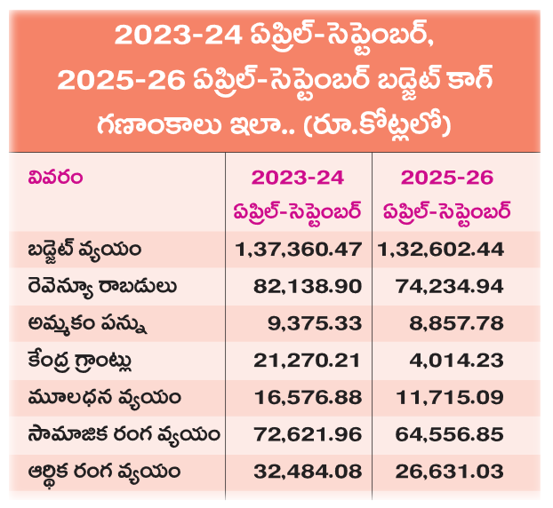 » మరోపక్క ఈ ఆర్థిక సంవత్సరం తొలి ఆరు నెలల్లో బడ్జెట్ వ్యయం సైతం తిరోగమనంలో ఉంది. 2023–24 ఏప్రిల్–సెప్టెంబరు కన్నా 2025–26లో 3.4 శాతం తగ్గింది.