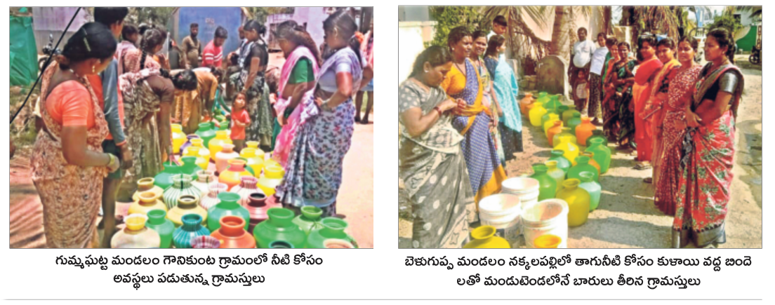 గుక్కెడు నీటి కోసం బిందెలు పట్టుకుని వేచి చూస్తున్న వీరు అనంతపురం జిల్లా ఉరవకొండ మండల పరిధిలోని వెలిగొండ గ్రామ ఎస్సీ కాలనీవాసులు. గ్రామంలో నెల రోజులుగా తాగునీరు సరఫరా కాకపోవడంతో వీరంతా అల్లాడిపోతున్నారు. తప్పని పరిస్థితుల్లో నీటిని కొనుగోలు చేసి దాహార్తి తీర్చుకుంటున్నారు. మండు వేసవిలో తాగునీరు సరఫరా కాకపోవడంతో కూలి పనులకు కూడా వెళ్లడం లేదని ఆవేదన వ్యక్తం చేస్తున్నారు.