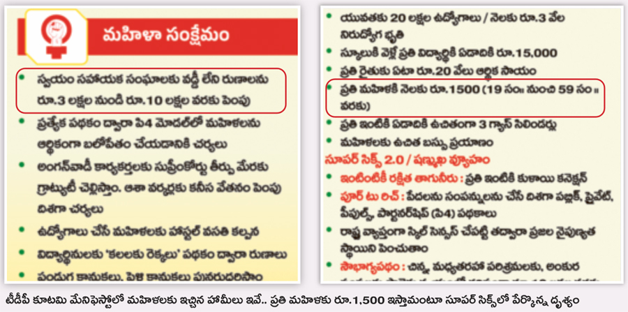 గత ప్రభుత్వం పొదుపు సంఘాల మహిళలు తీసుకునే రుణాలపై రూ.3 లక్షల వరకే సున్నా వడ్డీ అమలు చేసిందని, తాము అధికారంలోకి వస్తే సున్నా వడ్డీ రూ.10 లక్షల దాకా వర్తింపజేస్తామంటూ చంద్రబాబు, పవన్కళ్యాణ్ ఎన్నికల మేనిఫెస్టోలో హామీ ఇచ్చారు. కూటమి నేతల హామీ మేరకు ఈ పథకం అమలుకు ఏటా సుమారు రూ.ఆరు వేల కోట్ల దాకా అవసరమని అంచనా.