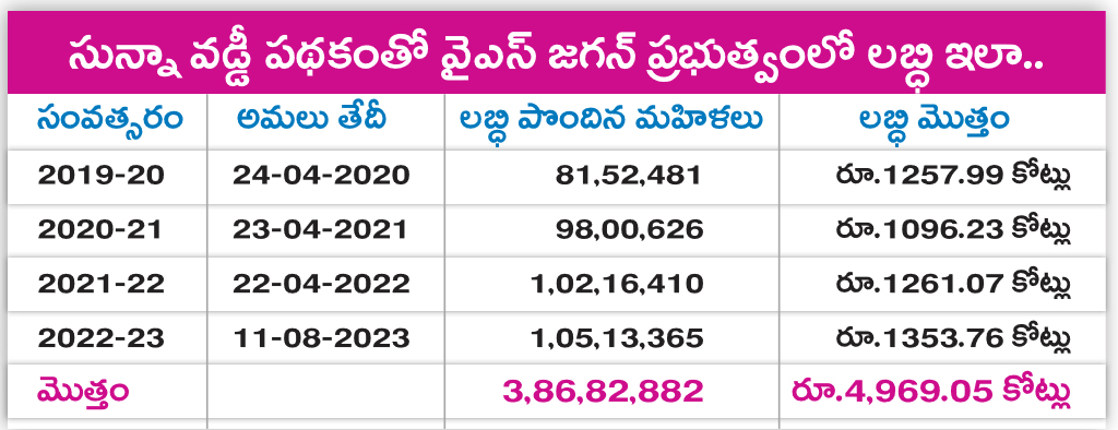 మహిళలకు నేరుగా పథకాలు అందచేయడంతో రూ.1.89 లక్షల కోట్ల మేర డీబీటీ విధానంలో ప్రయోజనం పొందారు. వైఎస్ జగన్ ప్రభుత్వం బ్యాంకుల ద్వారా అందజేసిన రూ.1.70 లక్షల కోట్ల రుణాలు కాకుండా స్త్రీనిధి ద్వారా దాదాపు మరో రూ.13,172 కోట్లు రుణాలు పొదుపు సంఘాల మహిళలకిచ్చింది. ఇక సున్నా వడ్డీ ద్వారా గత ప్రభుత్వ హయాంలో 3.86 కోట్ల మంది మహిళలు దాదాపు రూ.ఐదు వేల కోట్ల మేర ప్రయోజనం పొందారు.