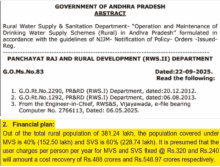 వివిధ వస్తువులపై జీఎస్టీని తగ్గించిన కేంద్రం ఆ నిర్ణయాన్ని సెపె్టంబరు 22వ తేదీ నుంచి అమలులోకి తీసుకురాగా.. చంద్రబాబు ప్రభుత్వం అదే రోజు యూజర్ చార్జీల వసూలుకు సంబంధించి ‘‘ఆంధ్రప్రదేశ్ గ్రామీణ తాగునీటి సరఫరా పథకాల నిర్వహణ’ పాలసీ జీవో విడుదల చేసింది. అయితే జీవో నెంబరు 83 వెంటనే ఆన్లైన్లో అందుబాటులో ఉంచకుండా ఆలస్యంగా వెలుగులోకి తెచ్చింది. గ్రామాల్లో ఇంటి పన్ను రూపంలో వసూలు చేసే మొత్తం కంటే నీటిపై ప్రతిపాదిత యూజర్ చార్జీలు చాలా ఎక్కువగా ఉండడం గమనార్హం.