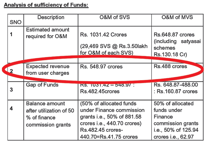 ఈ నేపథ్యంలో వీటి నిర్వహణకయ్యే మొత్తం ఖర్చు రూ.1,680.29 కోట్లలో కేంద్ర ప్రభుత్వం గ్రామ పంచాయతీలు, జిల్లా పరిషత్లకు ఇచ్చే 15వ ఆర్థిక సంఘం నిధుల నుంచి రూ.503.67 కోట్లు వ్యయం చేయనున్నట్లు పాలసీ ప్రణాళికలో పేర్కొన్నారు. మిగిలిన రూ.1,176.62 కోట్లలో రూ.1,036.97 కోట్లు ఆయా గ్రామాల్లో నివసించే ప్రజల నుంచి యూజర్ చార్జీల రూపంలో వసూలు చేయనుండగా కేవలం రూ.139.65 కోట్లు మాత్రమే రాష్ట్ర ప్రభుత్వం భరిస్తుందని పాలసీ ప్రణాళికలో పేర్కొన్నారు.