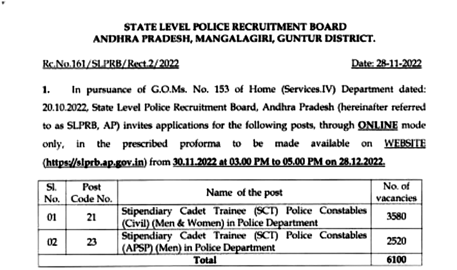 రాష్ట్రంలో పోలీసు వ్యవస్థను క్షేత్రస్థాయి నుంచి బలోపేతం చేసేందుకు గత వైఎస్సార్సీపీ ప్రభుత్వం కీలక నిర్ణయం తీసుకుంది. అందులో భాగంగా తొలుత 2022లో ఎస్సై పోస్టుల భర్తీకి నోటిఫికేషన్ ఇచ్చి రాత పరీక్షలూ నిర్వహించి 411 ఉద్యోగాలను భర్తీ చేసింది. అలాగే 6,100 కానిస్టేబుల్ పోస్టుల భర్తీ ప్రక్రియ చేపట్టింది. సివిల్ కానిస్టేబుల్ పోస్టులు 3,580, ఏపీఎస్పీ కానిస్టేబుల్ పోస్టులు 2,520 మొత్తం 6,100 పోలీస్ కానిస్టేబుల్ పోస్టుల భర్తీకి 2022, నవంబరులో నోటిఫికేషన్ జారీచేసింది.