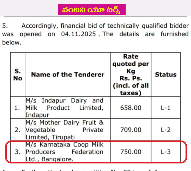 అంటే 2025 సెప్టెంబరులో పిలిచిన టెండర్లలో కూడా 20 లక్షల కిలోల నెయ్యి సరఫరా చేయగల సామర్థ్యం నందిని డెయిరీకి ఉందనేది స్పష్టమైంది. కేవలం ఇందాపూర్ డెయిరీ కోసమే ఆ రోజు 10 లక్షల కిలోల నెయ్యి టెండరు నుంచి నందిని పక్కకు తప్పుకొంది. మళ్లీ 2025 డిసెంబర్లో పిలిచిన సవరణ టెండర్లలో కిలో నెయ్యి రూ.716 చొప్పున బిడ్ దాఖలు చేసింది. అంటే ఇందాపూర్ డెయిరీకి కిలో రూ.658 చొప్పున కాంట్రాక్టు ఖరారు చేసేందుకే ఆ విధంగా అధిక ధరకు బిడ్ దాఖలు చేసింది. ఆ విధంగా చంద్రబాబు ముఠా ఇందాపూర్ డెయిరీకి అడ్డగోలుగా టెండరు ఖరారు చేసేందుకు పక్కాగా కథ నడపిందన్నది స్పష్టమవుతోంది.