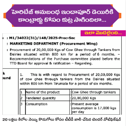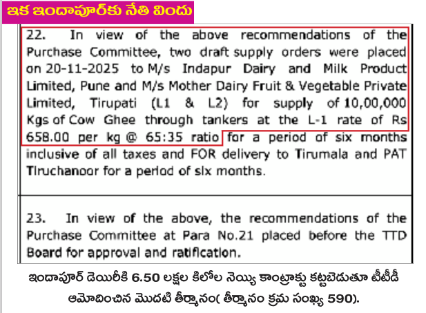 మిగిలిన 10 లక్షల కిలోల నెయ్యి కాంట్రాక్టును హెరిటేజ్ ఫుడ్స్ అనుబంధ సంస్థ ఇందాపూర్ డెయిరీకి కట్టబెట్టేందుకు పావులు కదిపారు. ఆ మేరకు టీటీడీ నెయ్యి కాంట్రాక్టుల్లో సవరణలు చేసి 2025 డిసెంబర్లో పది లక్షల కిలోల నెయ్యి చొప్పున మొత్తం మీద 20 లక్షల కిలోల నెయ్యి కొనుగోలు కోసం రెండు వేర్వేరు టెండర్లు పిలిచింది. ఇందాపూర్ డెయిరీకి కాంట్రాక్టు ఖరారయ్యేలా ఇతర డెయిరీలనూ మేనేజ్ చేశారు. ఇందాపూర్ డెయిరీకి అడ్డగోలుగా నెయ్యి కాంట్రాక్టులను ఖరారు చేస్తూ టీటీడీ పాలకమండలి ప్రత్యేకంగా రెండు తీర్మానాల (590 తీర్మానం, 605 తీర్మానం) ద్వారా కథ నడిపింది. అవి ఇలా ఉన్నాయి...