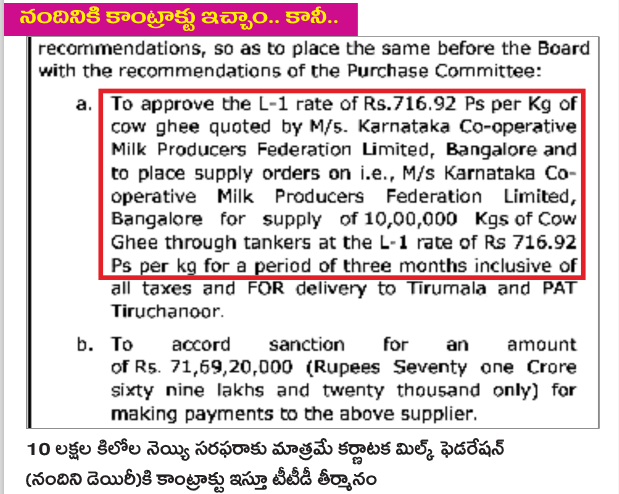 తాము 10 లక్షల కిలోల నెయ్యి మాత్రమే సరఫరా చేయగలమని తెలిపింది. కూటమి ప్రభుత్వ పెద్దలే ఆ విధంగా నందిని డెయిరీతో చెప్పించారన్నది బహిరంగ రహస్యం. మరి 20 లక్షల కిలోల నెయ్యి సరఫరా చేయలేని సంస్థ అసలు టెండర్లలో ఎందుకు పాల్గొంటుంది? అంటే కూటమి ప్రభుత్వ పెద్దలతో ముందుగా కుదుర్చుకున్న డీల్ ప్రకారమే నందిని డెయిరీ ఆ ప్రకటన చేసిందన్నది స్పష్టమవుతోంది. ఆ తర్వాత నందినీ డెయిరీకి 10 లక్షల కిలోల నెయ్యి సరఫరా కాంట్రాక్టు ఖరారు చేశారు.