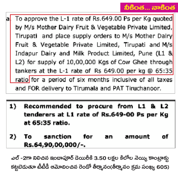 ఇందాపూర్ డెయిరీకి అనుకున్నట్టుగానే 10 లక్షల కిలోల నెయ్యి సరఫరా కాంట్రాక్టు దక్కింది. మరీ కిలో రూ.716.92 అంటే బాగుండదు అనుకున్నారో ఏమో.. టీటీడీ తీర్మానం 590 ప్రకారం కిలో నెయ్యి రూ.658 చొప్పున ఇందాపూర్ డెయిరీకి 6.50 లక్షల కిలోల నెయ్యి టెండర్ ఖరారు చేశారు. ఇక టీటీడీ తీర్మానం 605 ప్రకారం కిలో నెయ్యి రూ.649 చొప్పున ఇందాపూర్ డెయిరీకి 3.50 లక్షల కిలోల నెయ్యి టెండరు కట్టబెట్టారు.