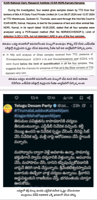 టీటీడీ నెయ్యిలో చేప నూనె కలిసే అవకాశం లేదని నిర్థారిస్తూ ఎన్డీడీబీ నివేదిక