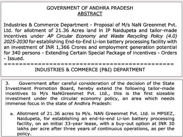 నాయుడుపేటలో ఎన్ఏఎన్ గ్రీన్మెట్ లిమిటెడ్కు అత్యంత విలువైన భూమిని ఎకరం రూ.30 లక్షలకు కేటాయిస్తూ ప్రభుత్వం ఇచ్చిన ఉత్తర్వులు