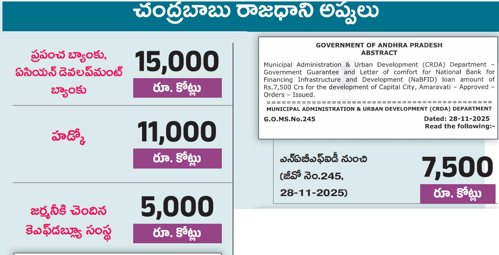 ⇒ రాజధాని పేరుతో, వివిధ కార్పొరేషన్ల పేరుతో ప్రభుత్వ గ్యారెంటీతో రూ.1,51,057 కోట్ల అప్పులు చేయడానికి పలు జీవోలు జారీ చేశారు. ఈ జీవోలన్నీ తప్పని ఆర్థిక మంత్రి కేశవ్ చెప్పగలరా? మరి బడ్జెట్ లోపల, బడ్జెట్ బయట కలిపి బాబు సర్కారు చేసిన అప్పులు రూ.3,33,321 కోట్లకు చేరాయి. వాస్తవాలు ఇలా ఉంటే మంత్రి కేశవ్ అప్పులపై ఉద్దేశ పూర్వకంగా పచ్చి అబద్ధాలు చెబుతున్నారు.