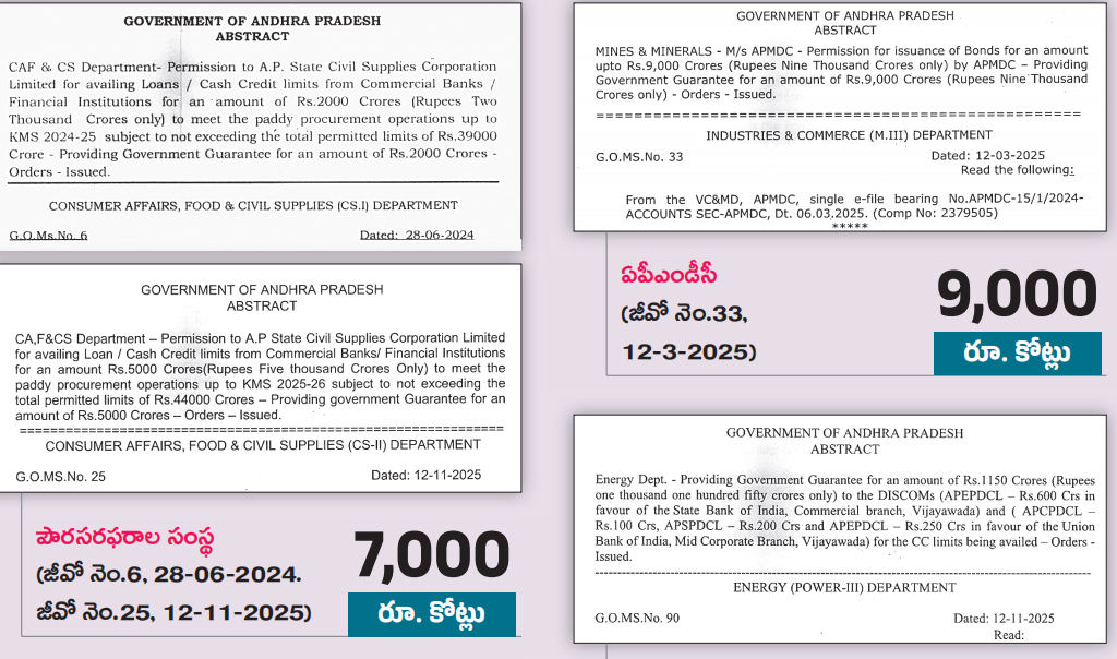 ⇒ ఆర్థిక మంత్రిగా బాధ్యతలు నిర్వహిస్తున్న పయ్యావుల కేశవ్ రాజ్యాంగ బద్ధమైన కాగ్, ఆర్బీఐ గణాంకాలను తప్పుగా పేర్కొనడం గమనార్హం. బడ్జెట్ బయట చంద్రబాబు సర్కారు 22 నెలల్లోనే వివిధ కార్పొరేషన్లు, రాజధాని పేరుతో ప్రభుత్వ గ్యారెంటీతో ఎడాపెడా అప్పులు చేసింది. ఇందుకు చంద్రబాబు సర్కారు జారీ చేసిన జీవోలే ప్రత్యక్ష సాక్ష్యం. ఈ జీవోల గురించి మంత్రి కేశవ్కు తెలియదా?