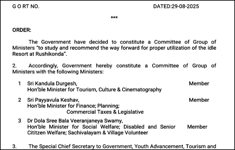 రుషికొండ భవనాలు పర్యాటక శాఖ రిసార్ట్ అంటూ వాస్తవాన్ని అంగీకరిస్తూ చంద్రబాబు ప్రభుత్వం ఉత్తర్వులు జారీ చేసింది. ఆ భవనాలను సముచితంగా ఉపయోగించుకునేలా అధ్యయనానికి, సిఫార్సులు చేయడానికి మంత్రుల బృందాన్ని ఏర్పాటు చేసింది. ఈ మేరకు రాష్ట్ర ప్రభుత్వ ప్రధాన కార్యదర్శి కె.విజయానంద్ శుక్రవారం ఉత్తర్వులు జారీ చేశారు.