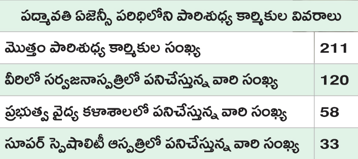 ⇒ పద్మావతి ఏజెన్సీ నిర్వాహకులు ఇప్పటికే 50 మంది వరకు సూపర్వైజర్లు, పారిశుధ్య కార్మీకులను విధుల్లోకి తీసుకున్నట్లు సమాచారం. అధికార పార్టీకి చెందిన వారిని విధుల్లోకి పురమాయించినట్లు తెలుస్తోంది. దీనికితోడు పారిశుధ్య కార్మికులను లక్ష్యంగా చేసుకుని ఏజెన్సీ మేనేజర్లు ఆస్పత్రిలో భయాందోళన వాతావరణం సృష్టిస్తున్నా రు. ఎప్పుడెప్పుడు సాగనంపుదామా అనే ఆలోచనలో నిమగ్నమయ్యారు.