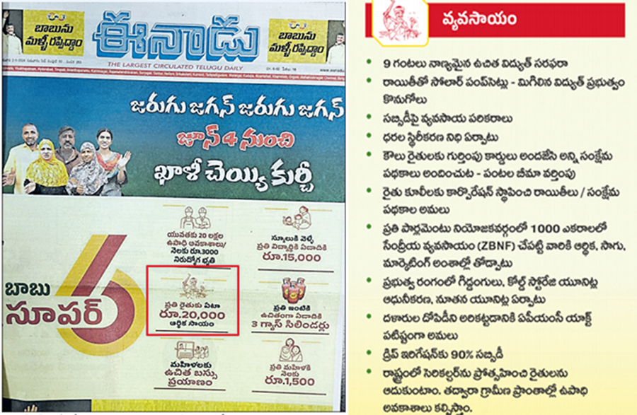 సూపర్ సిక్స్ హామీల్లో భాగంగా ప్రతి రైతుకూ ఏడాదికి రూ. 20 వేల ఆర్థిక సాయం అందిస్తామంటూ తెలుగుదేశం కరపత్రిక ఈనాడులో చంద్రబాబు ఇచ్చిన ప్రకటన , తెలుగుదేశం పార్టీ మేనిఫెస్టోలో వ్యవసాయరంగానికి ఇచ్చిన హామీలు