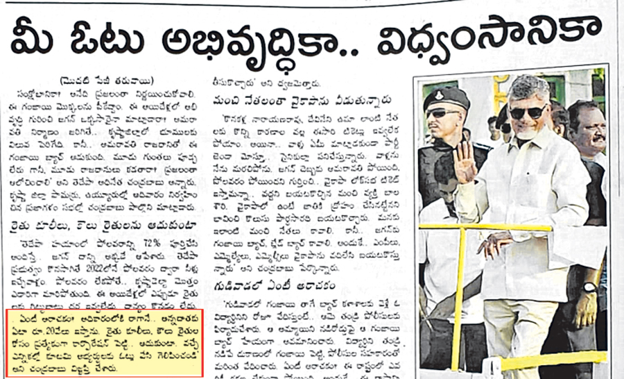 రైతు కూలీలు, కౌలు రైతులను ఆదుకుంటామని ఎన్నికల సమయంలో కృష్ణాజిల్లా పామర్రు, ఉయ్యూరులో నిర్వహించిన ప్రజాగళం సభలో చంద్రబాబు ఇచ్చిన హామీ
