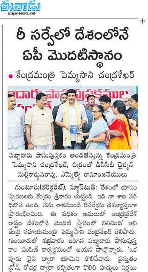 రీ సర్వేలో ఏపీ నంబర్ వన్ అంటూ కేంద్ర మంత్రి పెమ్మసాని కితాబు