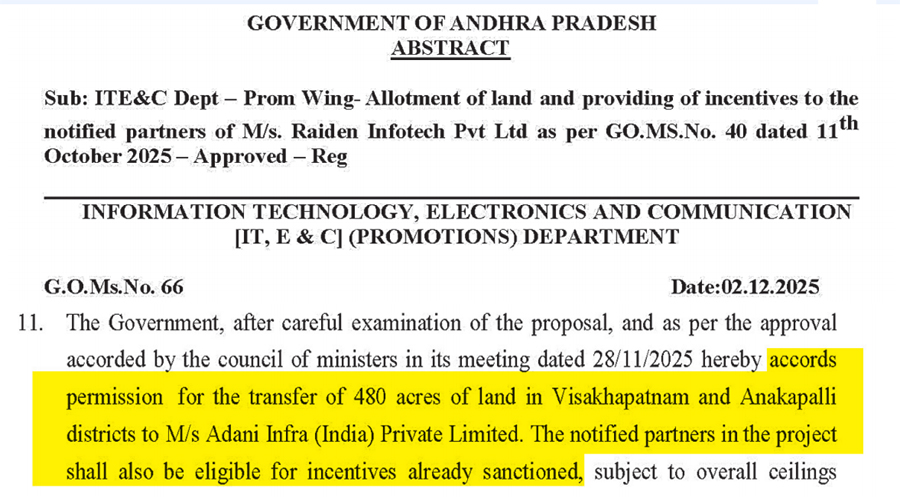 గూగుల్కు విశాఖలో కేటాయించిన 480 ఎకరాల భూమిని అదానీకి బదలాయిస్తూ రాష్ట్ర ప్రభుత్వం ఈ నెల 2వ తేదీన జారీ చేసిన జీవో