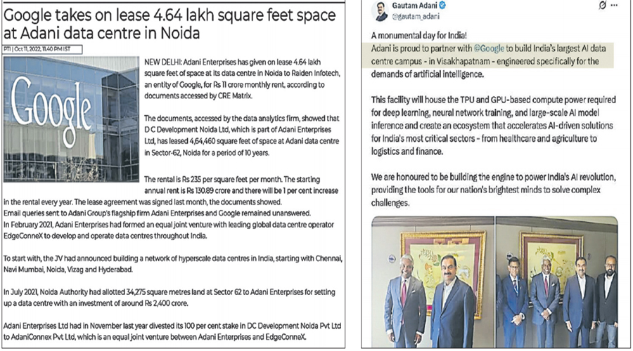 నొయిడాలోని అదానీ ఎంటర్ప్రైజెస్లో డేటా సెంటర్ ఏర్పాటు కోసం 4.64లక్షల చదరపు అడుగులను గూగుల్ అనుబంధ సంస్థ రైడాన్ ఇన్ఫోటెక్ లీజుకు తీసుకుందని 2022 అక్టోబర్ 11న టైమ్స్ ఆఫ్ ఇండియాలో వచ్చిన కథనం ఇది. , గూగుల్తో కలిసి విశాఖపట్నంలో అతిపెద్ద డేటా సెంటర్ ఏర్పాటు చేయనుండటం గర్వంగా ఉందని అదానీ గ్రూప్ అధినేత గౌతం అదానీ ‘ఎక్స్’లో పెట్టిన పోస్టు