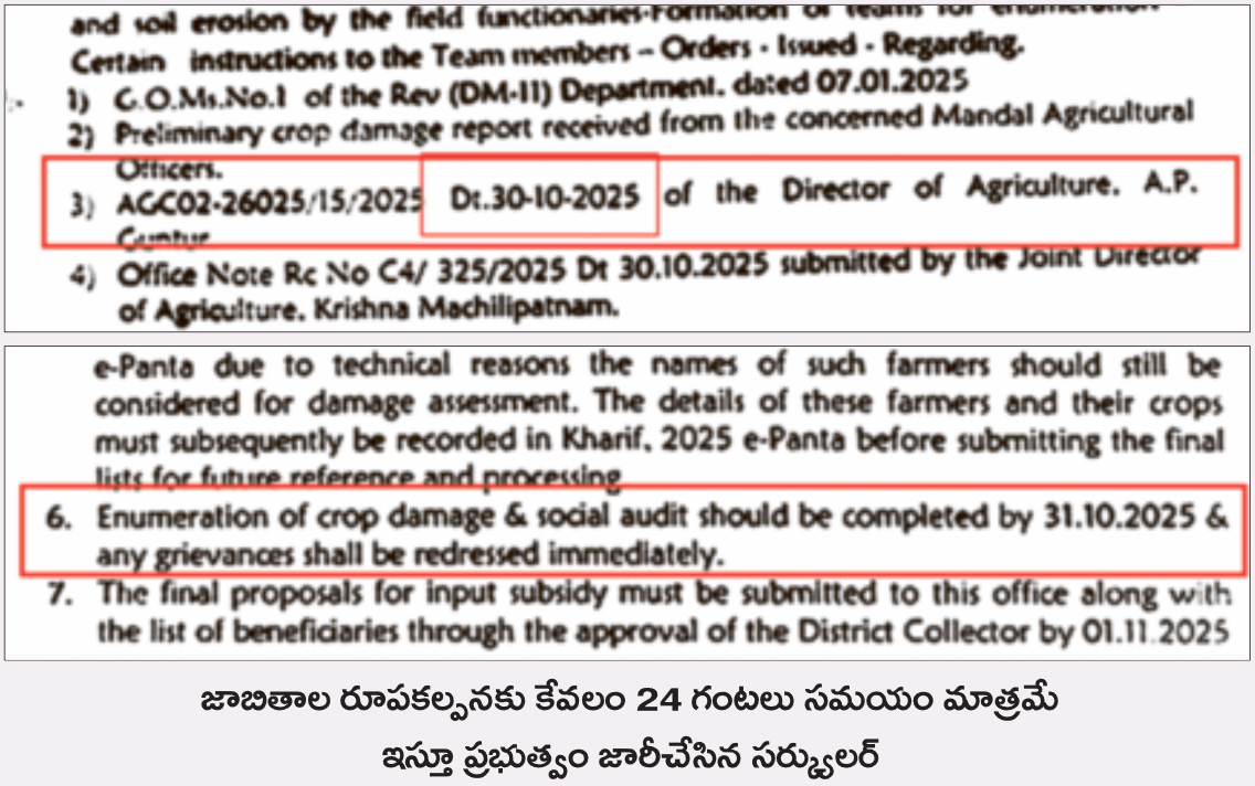 మోంథా తుపాను ప్రభావంతో నష్టపోయిన పంటలను, రైతులను గుర్తించేందుకు చేపట్టిన ఎన్యుమరేషన్ ప్రక్రియ అస్తవ్యçస్తంగా సాగింది. గత నెల 31వ తేదీ సాయంత్రంలోగా తుది జాబితాలు తయారు చేయాలని ఆదేశిస్తూ ఒక్క రోజు ముందు అంటే 30వ తేదీన సర్క్యులర్ జారీ చేసిన విషయం తెలిసిందే. తుది అంచనాల తయారీకి కేవలం 24 గంటలు మాత్రమే గడువు ఇవ్వడంపై సర్వత్రా విమర్శలు వెల్లువెత్తాయి. గడువు పెంచాలని రైతులు, రైతు సంఘాల నుంచి డిమాండ్లు వెల్లువెత్తాయి.