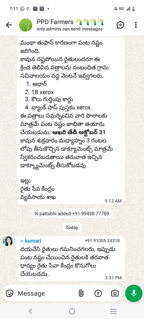 అక్టోబర్ 31 లోపు పంట నష్టం వివరాలను తెలపాలంటూ రైతులకు ప్రభుత్వం పంపిన మెసేజ్