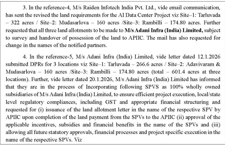 ⇒ ఈ నేపథ్యంలో రూ.87,250 కోట్ల పెట్టుబడితో 1,000 మెగావాట్ల డేటా సెంటర్ను అదానీ ఇన్ఫ్రా ఏర్పాటు చేస్తున్నట్లు ప్రభుత్వం ఉత్తర్వులో పేర్కొనడం గమనార్హం. గూగుల్ అనుబంధ సంస్థ రైడెన్ ఇన్ఫోటెక్ ఇండియా ప్రైవేట్ లిమిటెడ్ అభ్యర్థన మేరకు భూ కేటాయింపులు పెంచి, ఆ మేరకు అదానీ ఇన్ఫ్రాకు కేటాయించినట్లు తెలిపింది.