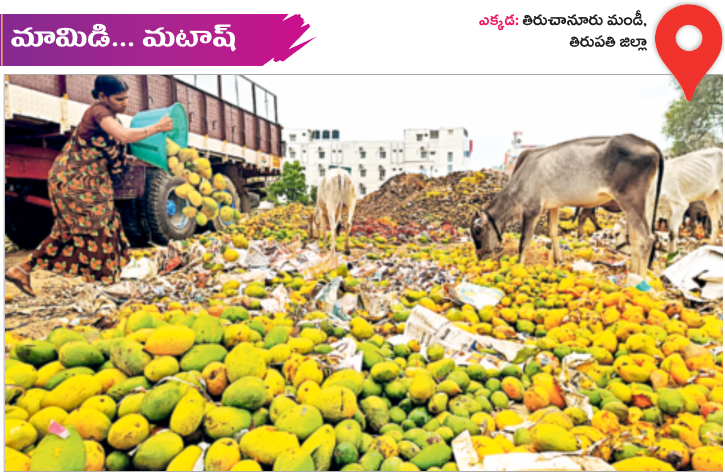 చంద్రబాబు ప్రభుత్వ నిర్లక్ష్యం కారణంగా ఈ ఏడాది పల్ప్ ఫ్యాక్టరీలు, దళారీలు కలిసి ధరలు భారీగా తగ్గించేయడంతో తిరుచానూరు మండీలో రైతులు పారబోసిన మామిడి కాయలు (ఫైల్)