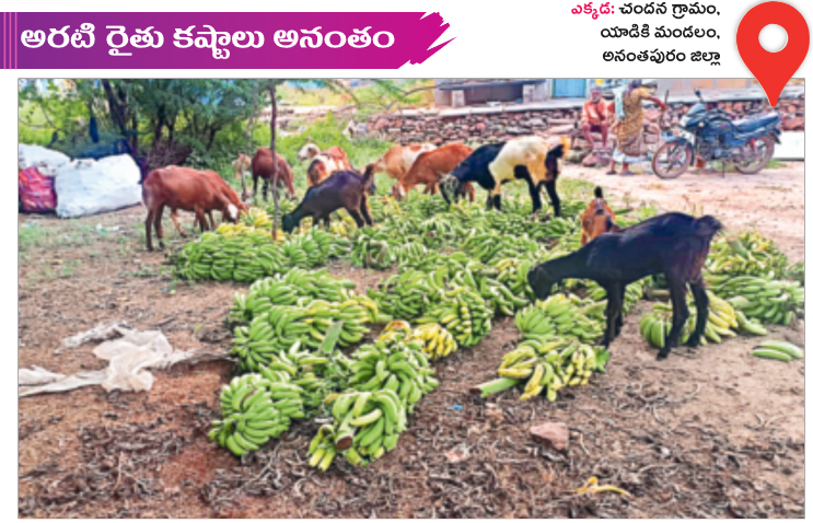 అరటి ధరలు భారీగా పతనమవడంతో మార్కెట్కు తీసుకెళ్తే రవాణా ఖర్చులు దండగని అనంతపురం జిల్లా యాడికి మండలం చందన గ్రామంలో మేకలు, గొర్రెలకు మేతగా వదిలేసిన అరటి గెలలు (ఫైల్)